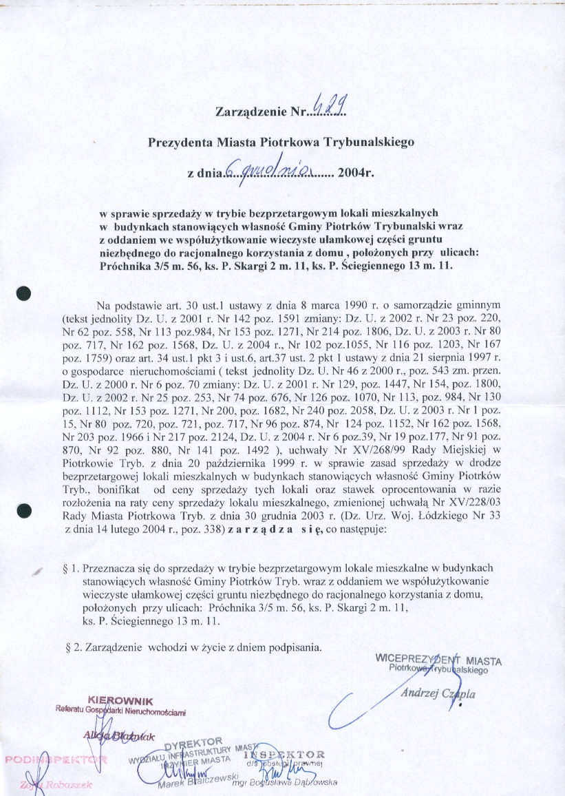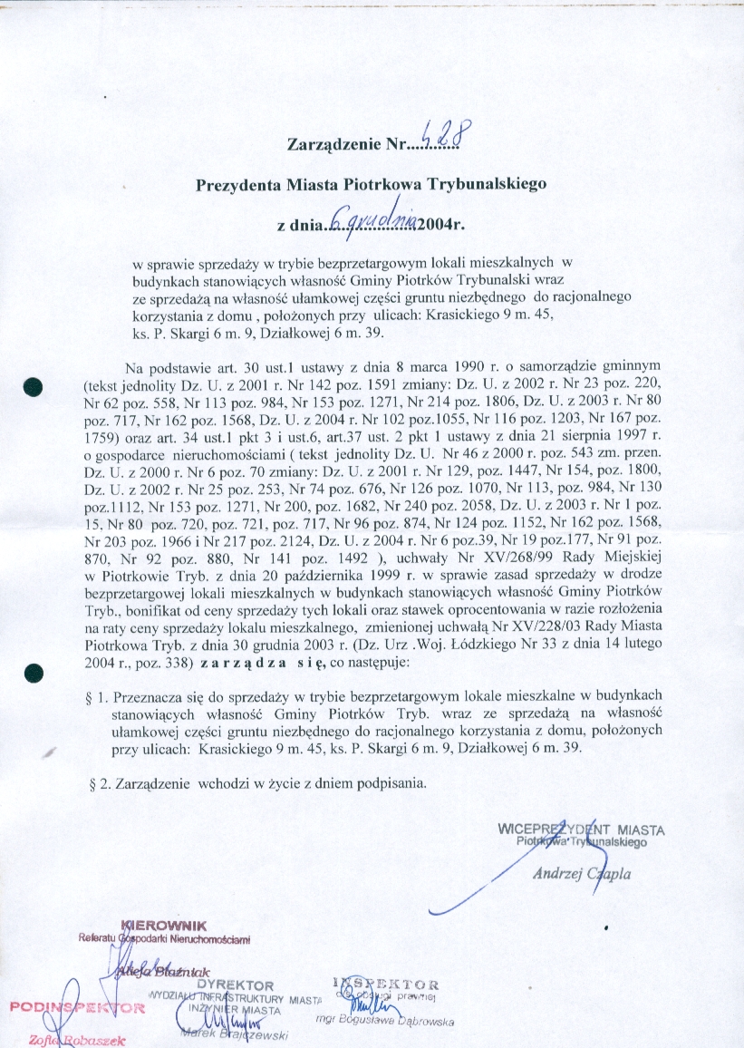 - Zarządzenie Nr 428 z dn. 06.12.04 r. ws. sprzedazy w trybie bezprzetargowym lokali mieszkalnych w budynkach stanowiących własność Gminy Piotrków Trybunalski wraz ze sprzedażą na własność ułamkowej części gruntu niezbędnego do racjonalnego korzystania z domu, położonych przy ulicach: Krasickiego 9 m. 45, ks. P. Skargi 6 m. 9, Działkowej 6 m. 39756 KBOtwórz plik w Google Docs - Viewer