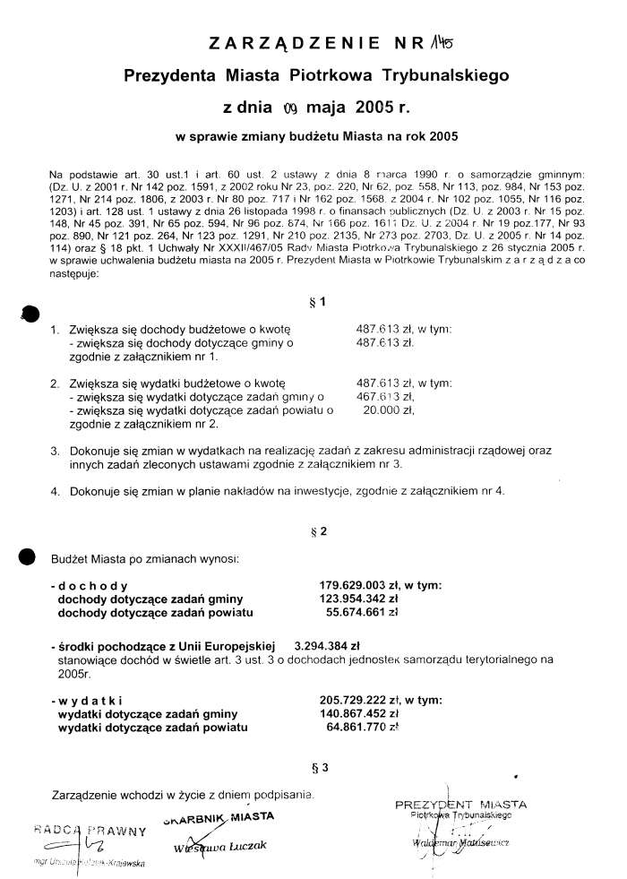 artykuł nr 25Zarządzenie Nr 145 z dn. 9 maja 2005 r. Załączniki:Zarządzenie Nr 145 z dn. 09.05.2005 r. w/s zmiany budżetu Miasta na 2005 r.75 KBOtwórz plik w Google Docs - Viewer