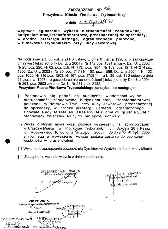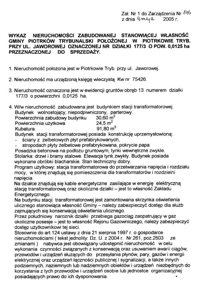 artykuł nr 24Zarządzenie Nr 146 z dn. 9 maja 2005 r. Załączniki:Załącznik Nr 1 - str. 2104 KBOtwórz plik w Google Docs - ViewerZałącznik Nr 1 - Wykaz nieruchomości zabudowanej stanowiącej własność Gminy Piotrków Trybunalski położonej przy ul. Jaworowej, oznaczonej nr działki 177/3 o pow. 0,0125 ha przeznaczonej do sprzedaży113 KBOtwórz plik w Google Docs - ViewerZarządzenie Nr 146 z dn. 9.05.2005 r. w/s ogłoszenia wykazu nieruchomości zabudowanej budynkiem stacji transformatorowej, przeznaczonej do sprzedaży w drodze przetargu ustnego ograniczonego, położonej w Piotrkowie Trybunalskim przy ul. Jaworowej91 KBOtwórz plik w Google Docs - Viewer
