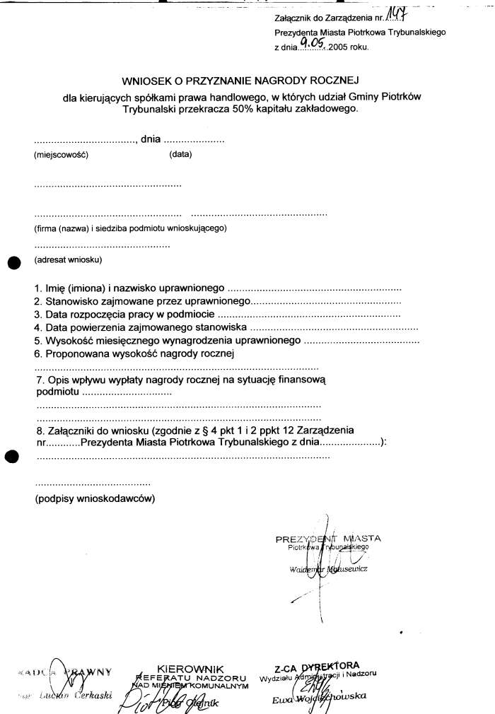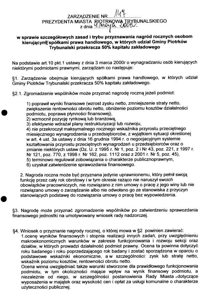 artykuł nr 23Zarządzenie Nr 147 z dn. 9 maja 2005 r. Załączniki:Załącznik Nr 1 - Wniosek o przyznanie nagrody rocznej62 KBOtwórz plik w Google Docs - ViewerZarządzenie Nr 147 - str. 288 KBOtwórz plik w Google Docs - ViewerZarządzenie Nr 147 z dn. 9.05.05 r. w/s szczegółowych zasad przyznawania nagród rocznych osobom kierującym spółkami prawa handlowego, w których udział Gminy Piotrków Trybunalski przekracza 50% kapitału zakładowego123 KBOtwórz plik w Google Docs - Viewer