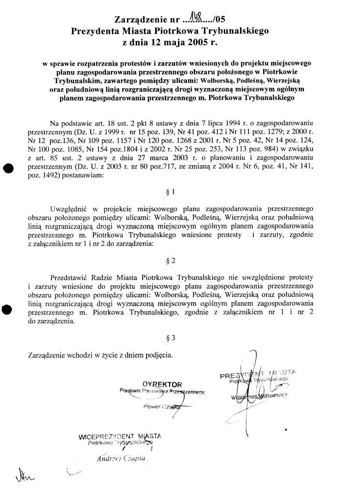 artykuł nr 22Zarządzenie Nr 148 z dn. 12 maja 2005 r. Załączniki:Zarządzenie Nr 148 z dn. 12.05.05 r. w/s rozpatrzenia protestów i zarzutów wniesionych do projektu miejscowego planu zagospodarowania przestrzennego obszaru położonego w Piotrkowie Trybunalskim, zawartego między ulicami: Wolborską, Podleśną, Wierzejską oraz południową linią rozgraniczającą drogi wyznaczoną miejscowym ogólnym planem zagospodarowania przestrzennego m. Piotrkowa Trybunalskiego84 KBOtwórz plik w Google Docs - Viewer