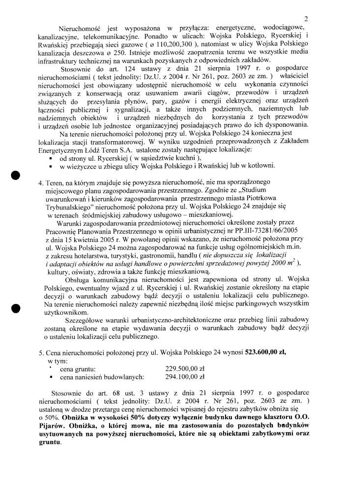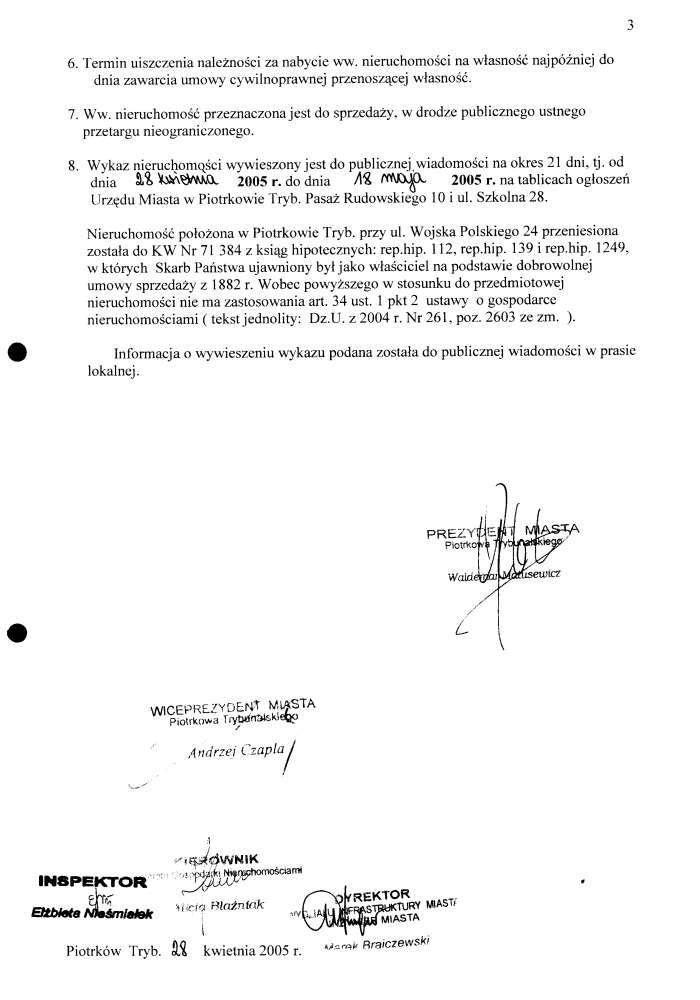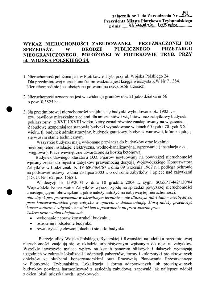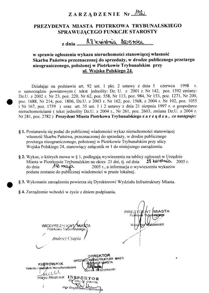 artykuł nr 38Zarządzenie Nr 132 z dn. 28 kwietnia 2005 r. Załączniki:Załącznik Nr 1 - str. 354 KBOtwórz plik w Google Docs - ViewerZałącznik Nr 1 - str. 2123 KBOtwórz plik w Google Docs - ViewerZałącznik Nr 1 - Wykaz nieruchomości zabudowanej, przeznaczonej do sprzedaży, w drodze publicznego przetargu nieograniczonego, położonej w Piotrkowie przy ul. Wojska Polskiego 24104 KBOtwórz plik w Google Docs - ViewerZarzadzenie Nr 132 z d. 28.04.05 r. w/s ogłoszenia wykazu nieruchomości stanowiącej własność Skarbu Państwa przeznaczonej do sprzedaży, w drodze publicznego przetargu nieobraniczonego, położonej w Piotrkowie Trybuanslkim przy ul. Wojska Polskiego 2482 KBOtwórz plik w Google Docs - Viewer