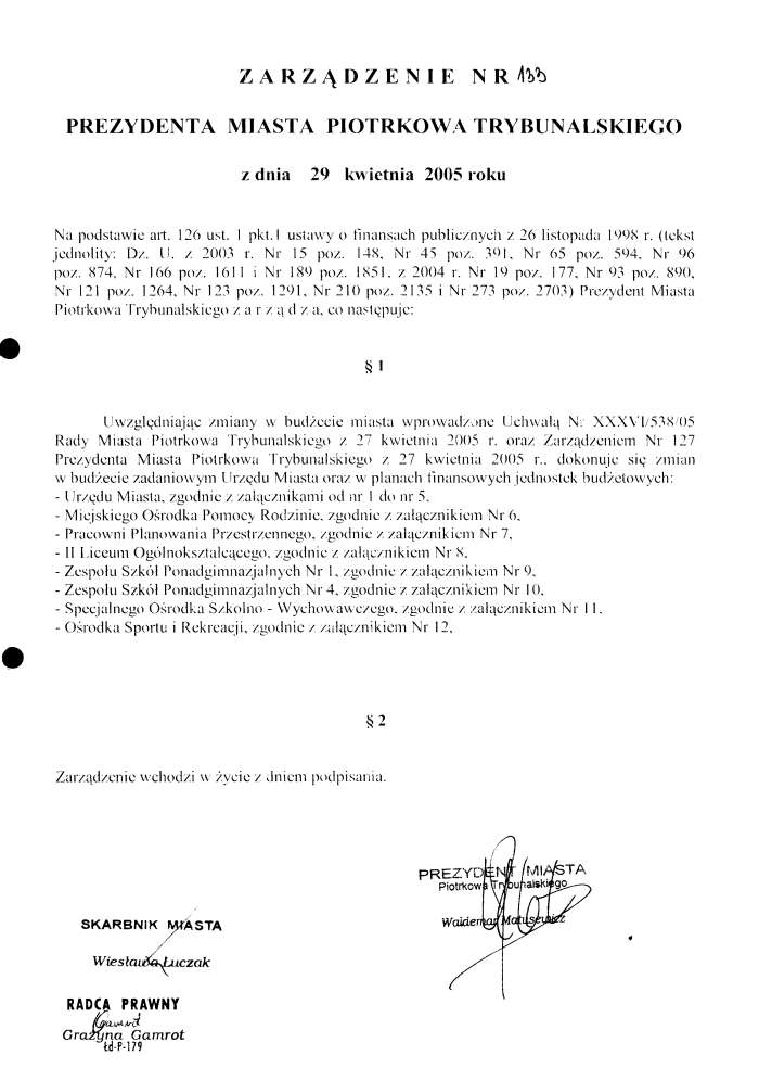 artykuł nr 37Zarządzenie Nr 133 z dn. 29 kwietnia 2005 r. Załączniki:Zarządzenie Nr 133 z dn. 29.04.05 r. w/s Zmian w budżecie Miasta61 KBOtwórz plik w Google Docs - Viewer