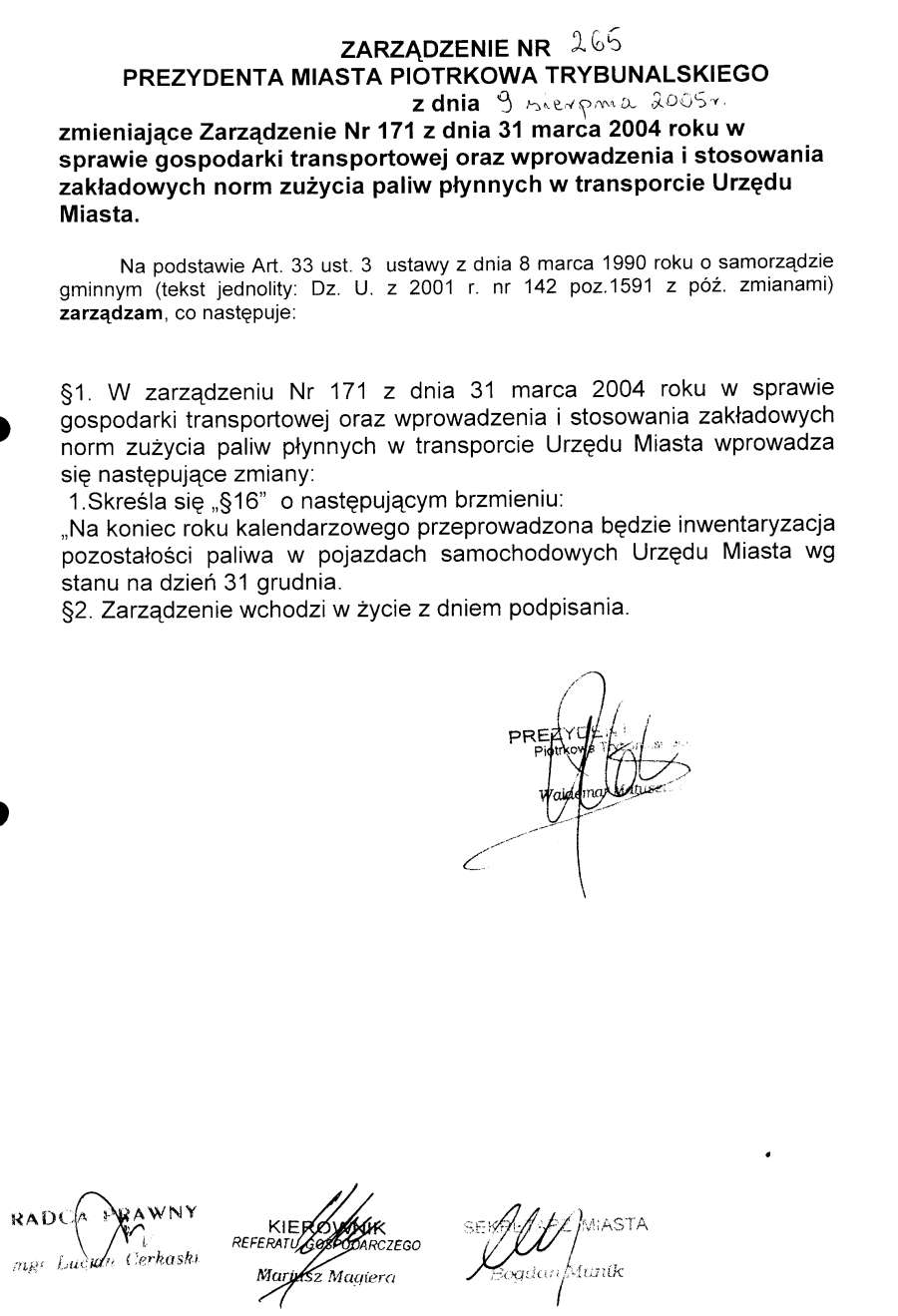 Zarządzenie Nr 265 z dn. 9 sierpnia 2005 r.