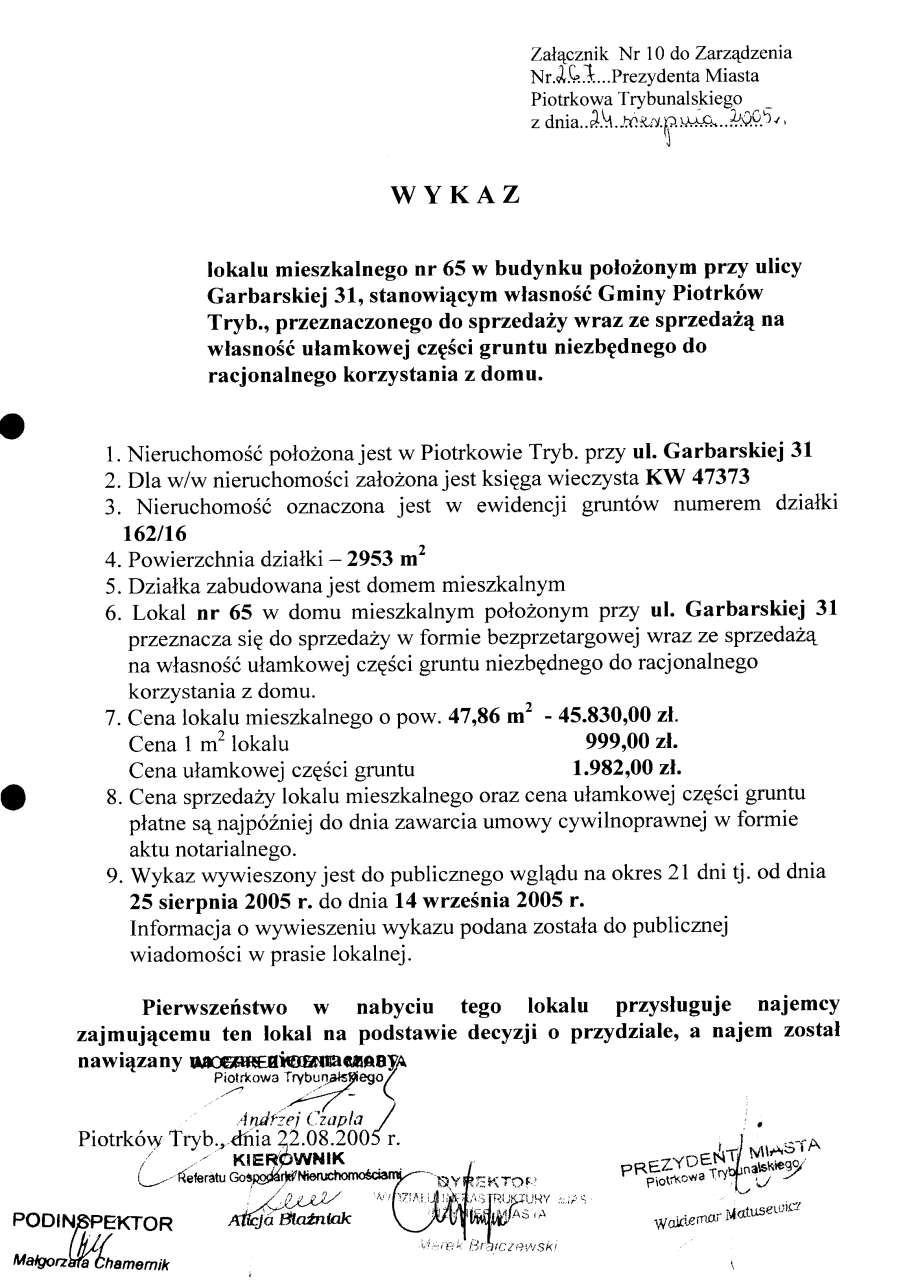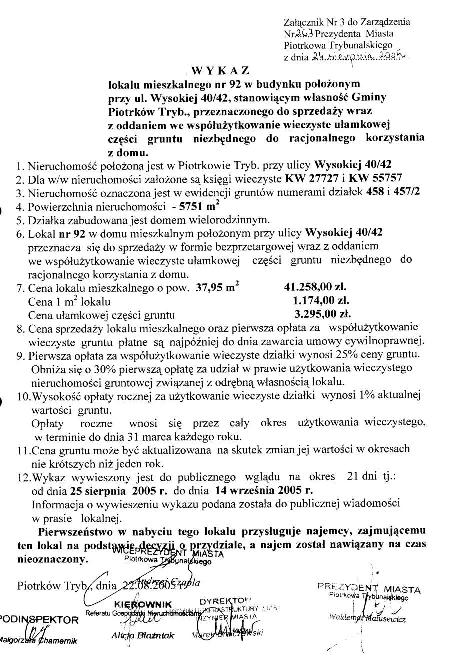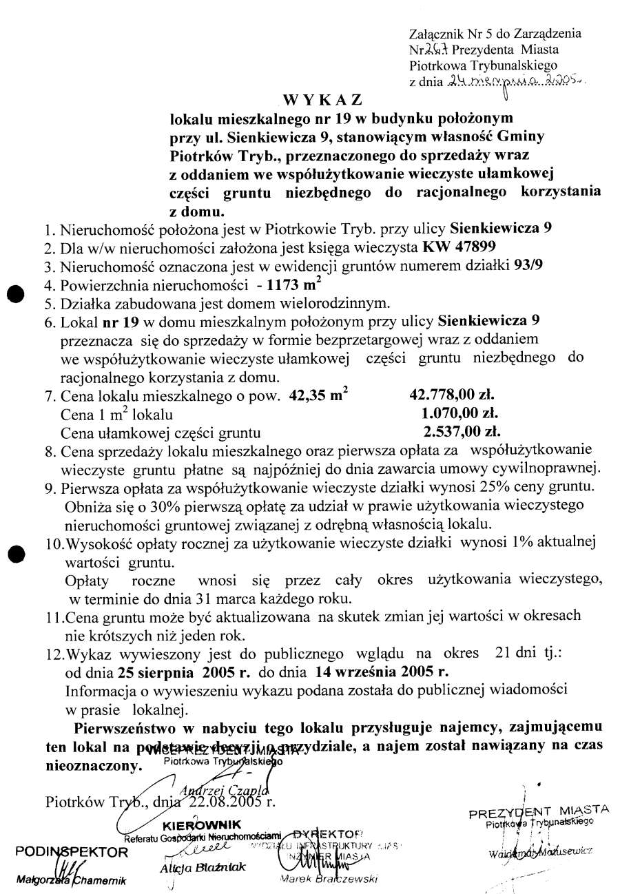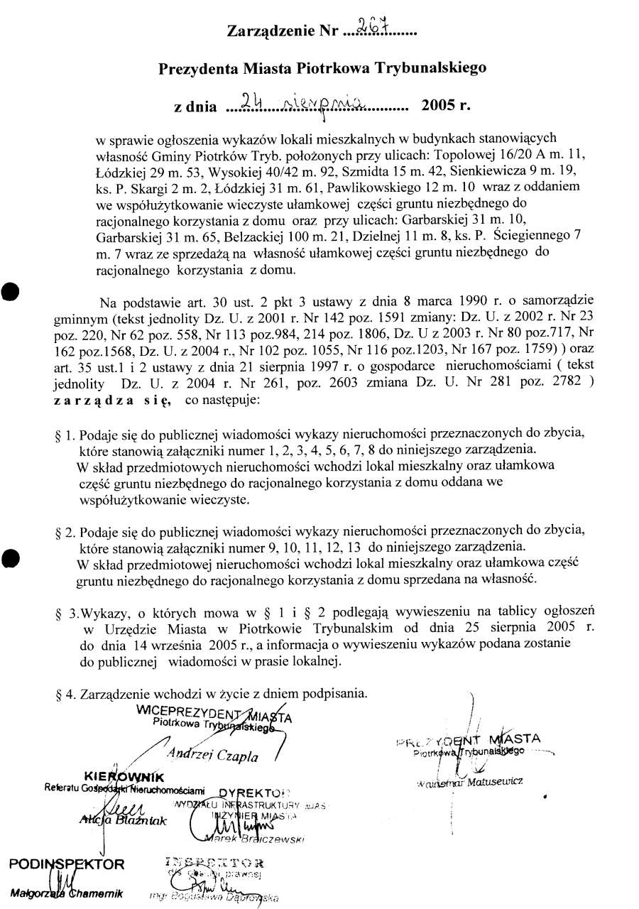 - Zarządzenie Nr 267 z dn. 24.08.2005 r. w/s ogłoszenia wykazów lokali mieszkalnych w budynkach stanowiących własność Gminy Piotrków TRybunalski położonych przy ul. Topolowej, Łódzkiej, Wyskokiej. Szmidta, Sienkiewicza, ks. P. Skargi, Pawlikowskiego wraz z oddaniem we współużytkowanie wieczyste ułamkowej części gruntu niezbędnego do racjonalnegi korzystania z domu opraz przy ul. Garbarskiej, Belzackiej, Dzielnej, ks. P. Ściegiennego wraz ze sprzedażą na własność ułamkowej części gruntu niezbędnego do racjonalnego korzystania z domu173 KBOtwórz plik w Google Docs - Viewer