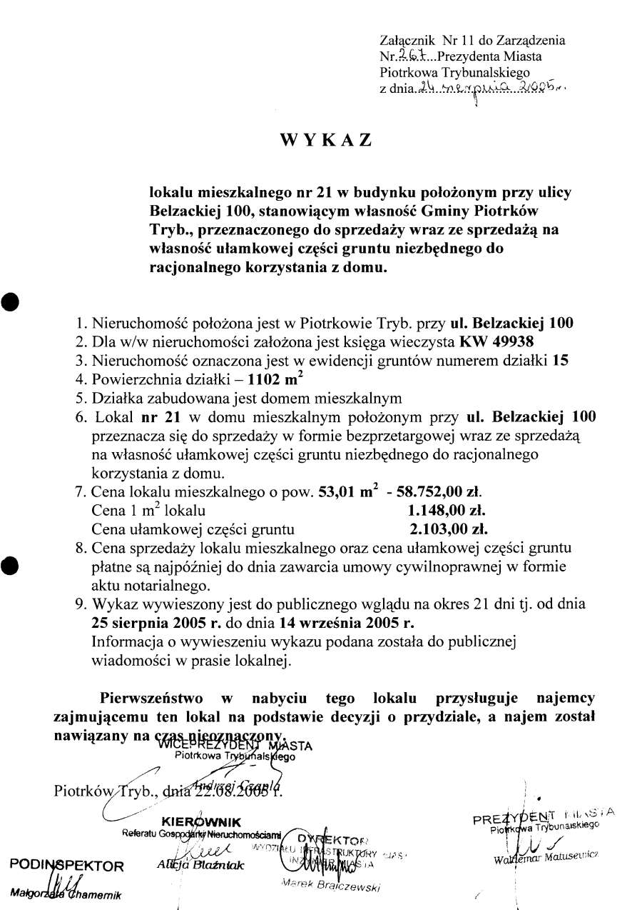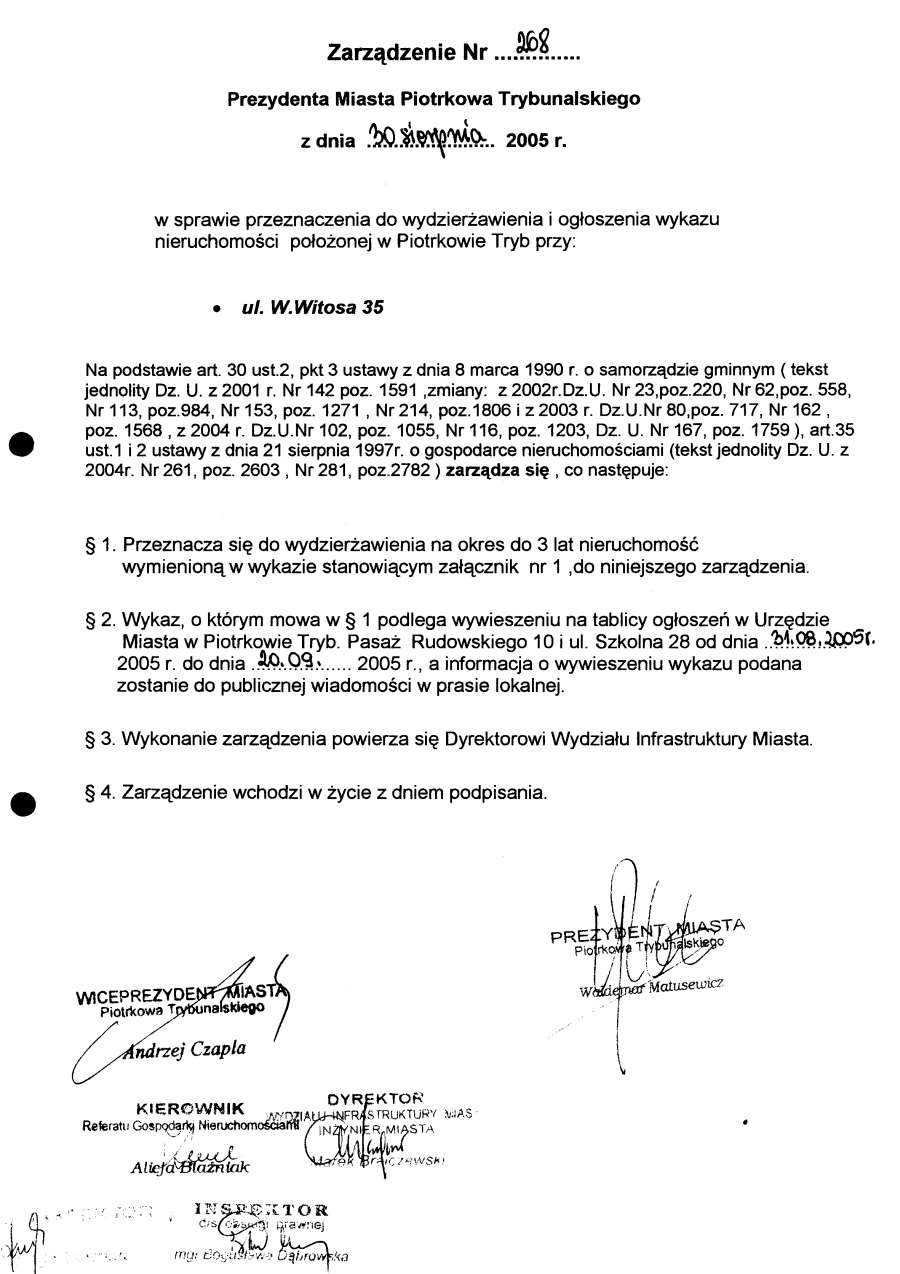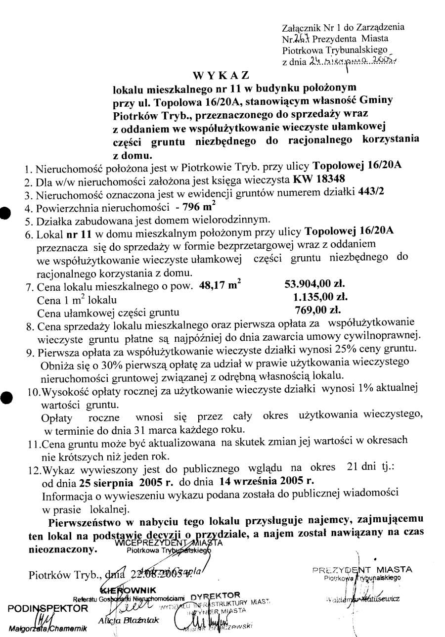- Zarządzenie Nr 267 z dn. 24.08.2005 r. w/s ogłoszenia wykazów lokali mieszkalnych w budynkach stanowiących własność Gminy Piotrków TRybunalski położonych przy ul. Topolowej, Łódzkiej, Wyskokiej. Szmidta, Sienkiewicza, ks. P. Skargi, Pawlikowskiego wraz z oddaniem we współużytkowanie wieczyste ułamkowej części gruntu niezbędnego do racjonalnegi korzystania z domu opraz przy ul. Garbarskiej, Belzackiej, Dzielnej, ks. P. Ściegiennego wraz ze sprzedażą na własność ułamkowej części gruntu niezbędnego do racjonalnego korzystania z domu173 KBOtwórz plik w Google Docs - Viewer