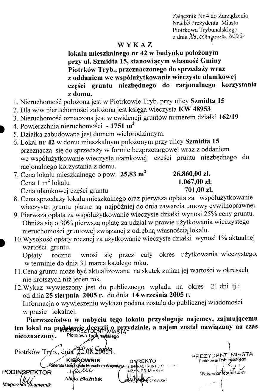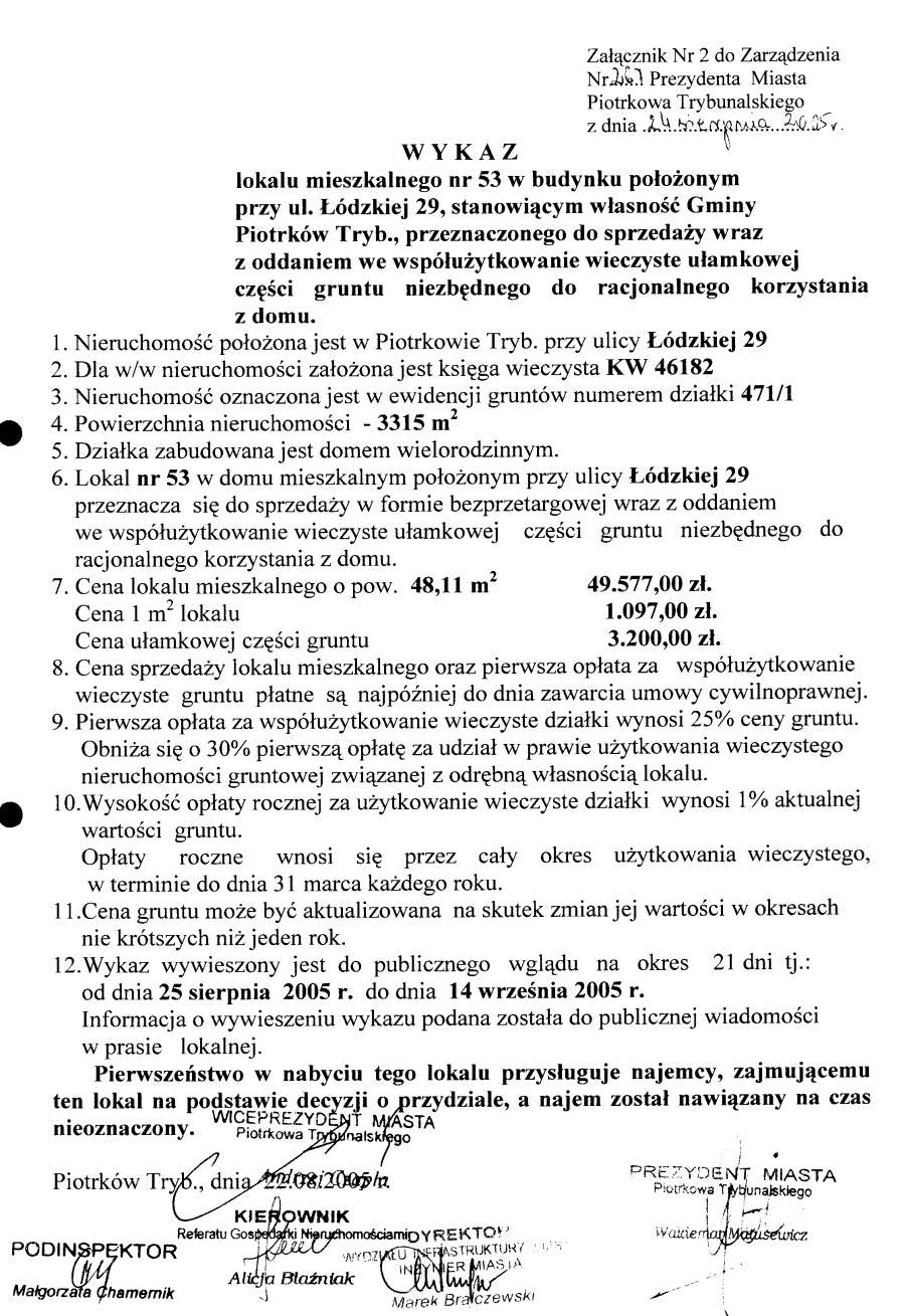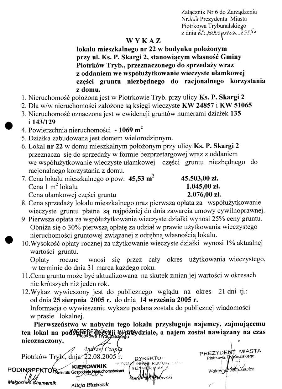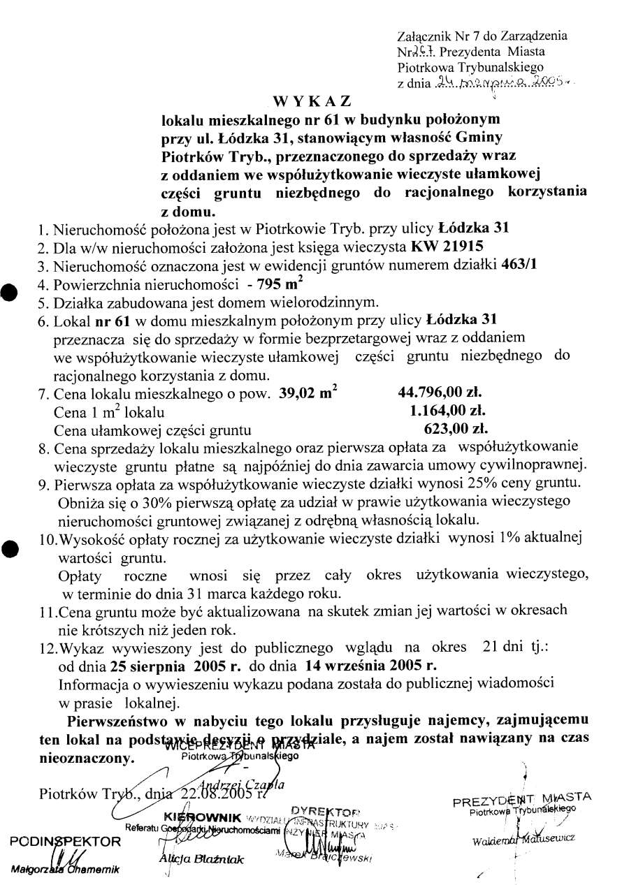 - Zarządzenie Nr 267 z dn. 24.08.2005 r. w/s ogłoszenia wykazów lokali mieszkalnych w budynkach stanowiących własność Gminy Piotrków TRybunalski położonych przy ul. Topolowej, Łódzkiej, Wyskokiej. Szmidta, Sienkiewicza, ks. P. Skargi, Pawlikowskiego wraz z oddaniem we współużytkowanie wieczyste ułamkowej części gruntu niezbędnego do racjonalnegi korzystania z domu opraz przy ul. Garbarskiej, Belzackiej, Dzielnej, ks. P. Ściegiennego wraz ze sprzedażą na własność ułamkowej części gruntu niezbędnego do racjonalnego korzystania z domu173 KBOtwórz plik w Google Docs - Viewer