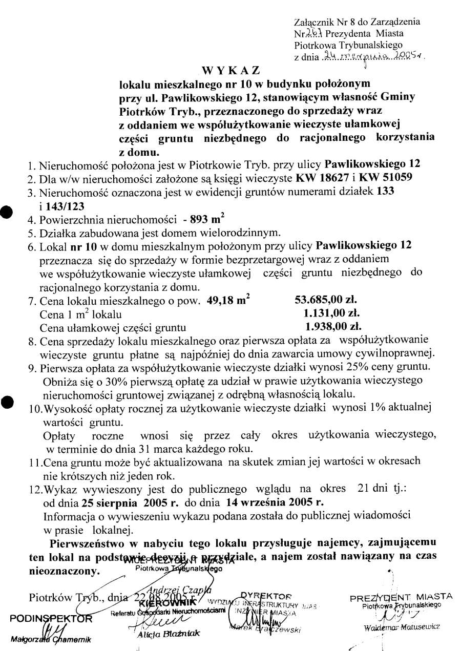 - Załącznik Nr 8 - wykaz lokalu mieszkalnego nr 10 w budynku położonym przy ul. Pawlikowskiego 12, stanowiącym własność Gminy Piotrków Trybunalski, przeznaczonego do sprzedaży wraz z oddaniem we współużytkowa wieczyste ułamkowej części gruntu niezbędnego do racjonalnego korzystania z domu190 KBOtwórz plik w Google Docs - Viewer