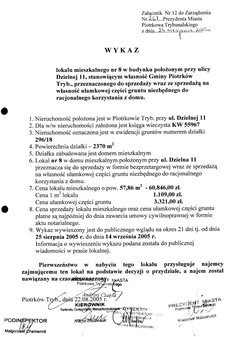 - Załącznik Nr 12 - wykaz lokalu mieszkalnego nr 8 w budynku położonym przy ul. Dzielnej 11, stanowiącym własność Gminy Piotrków Trybunalski, przeznaczonego do sprzedaży wraz ze sprzedażą na własność ułamkowej części gruntu niezbędnego do racjonalnego korzystania z domu149 KBOtwórz plik w Google Docs - Viewer