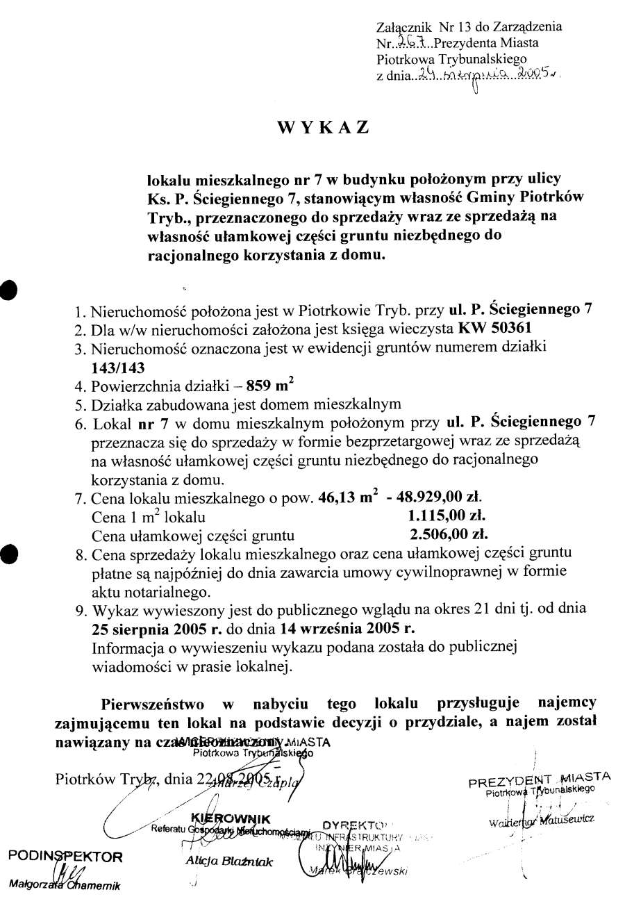 - Załącznik Nr 13 - wykaz lokalu mieszkalnego nr 7 w budynku położonym przy ul. ks. P. Ściegiennego 7, stanowiącym własność Gminy Piotrków Trybunalski, przeznaczonego do sprzedaży wraz ze sprzedażą na własność ułamkowej części gruntu niezbędnego do racjonalnego korzystania z domu152 KBOtwórz plik w Google Docs - Viewer