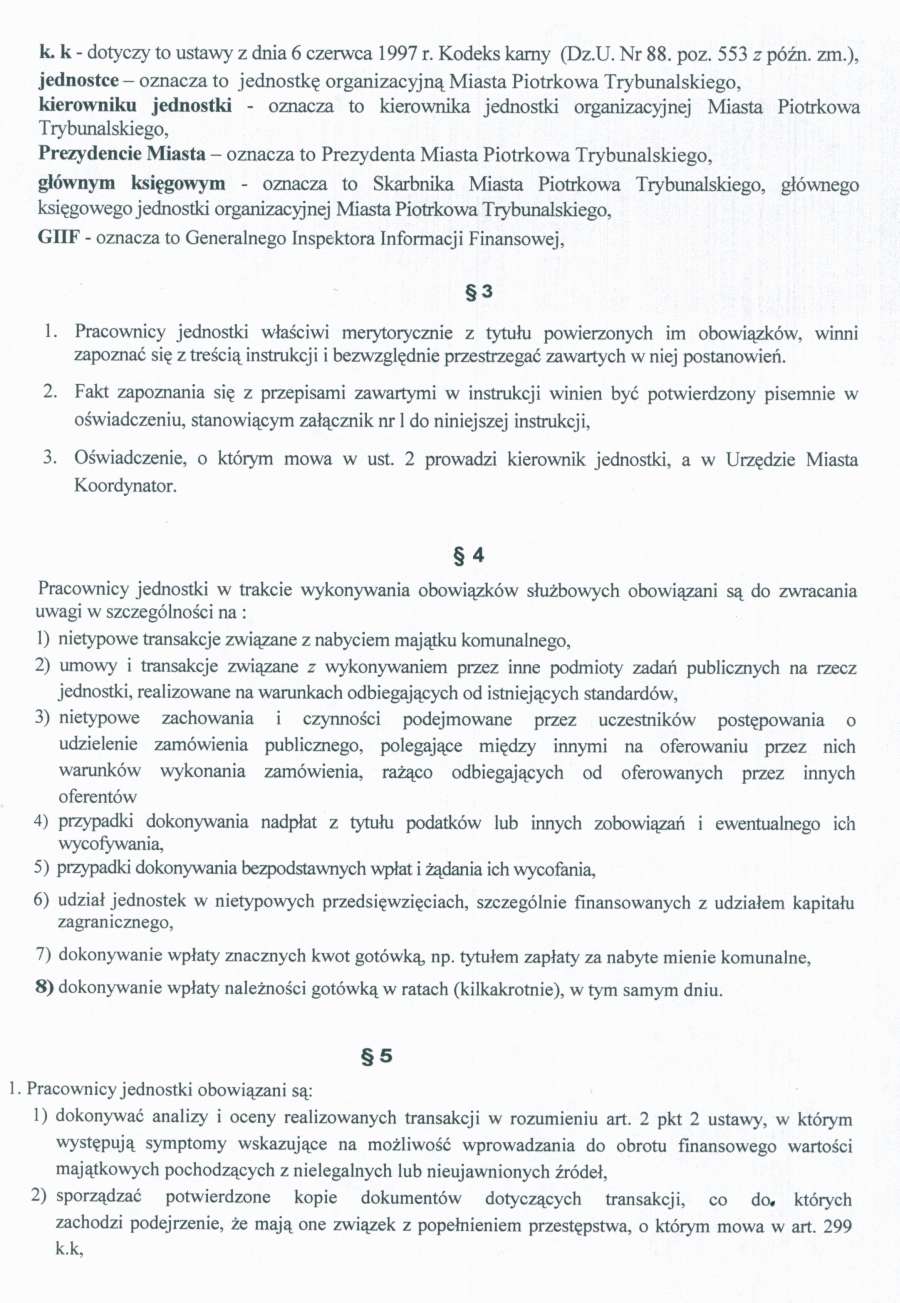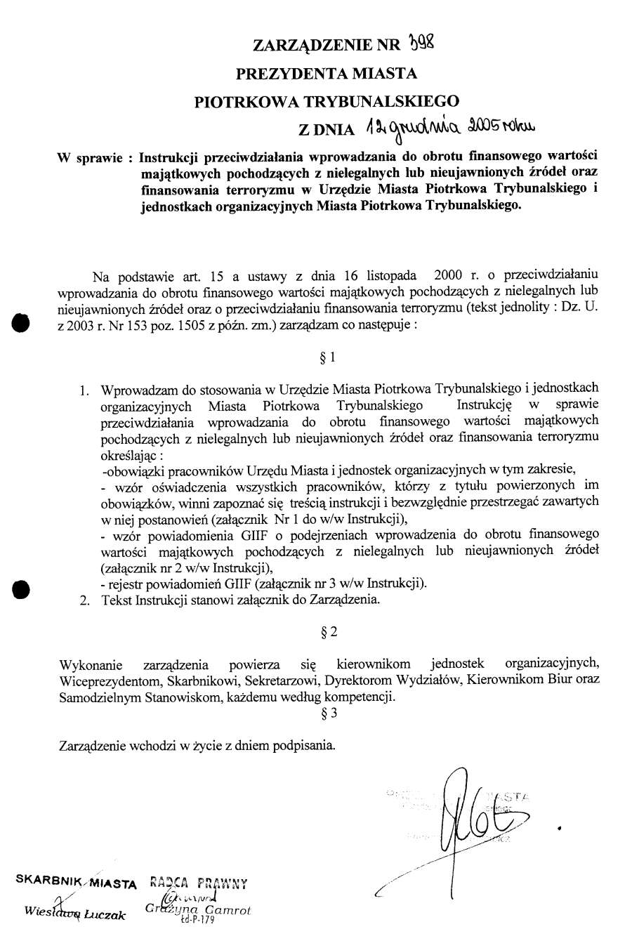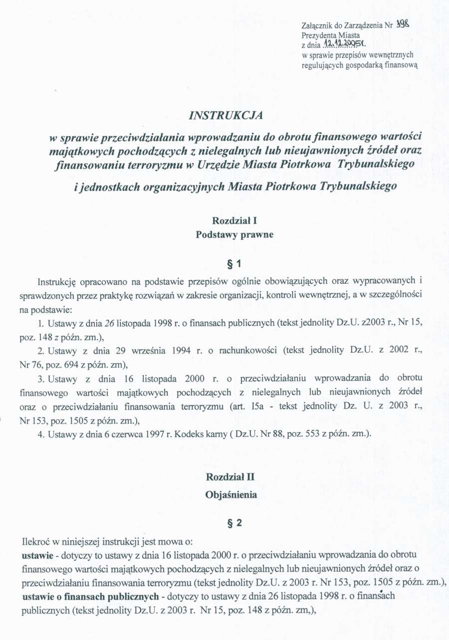 - Zarzadzenie Nr 398 z dn. 12.12.05 r. w/s insrtukcji przeciwdziałania wprowadzaniu do obrotu finansowego wartości majątkowych pochodzących z nielegalnych lub nieujawnionych źródeł oraz finansowania terroryzmu w Urzedzie Miasta Piotrkowa Trybunalskiego i jednostkach organizacyjnych Miasta Piotrkowa Trybunalskiego130 KBOtwórz plik w Google Docs - Viewer