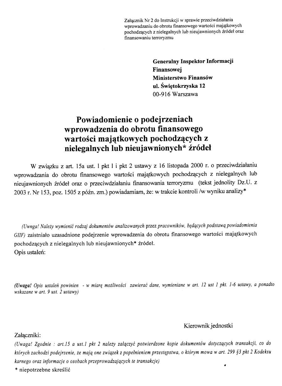 - Załącznik Nr 2 - Powiadomienie o podejrzeniach wprowadzenia do obrotu finansowego wartości majątkowych pochodzących z nielegalnych lub nieujawnionych źródeł90 KBOtwórz plik w Google Docs - Viewer