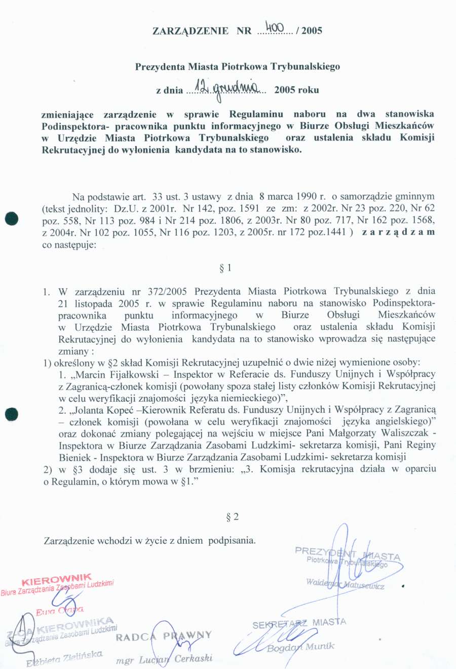 - Zarządzenie Nr 400 z dn. 12.12.05. r. zmieniajace zarzadzenie w/s Regulaminu naboru na dwa stanowiska Podinspektora - pracownika punktu informacyjnego w Biurze Obsługi Mieszkańców w Urzedzie Miasta Piotrkowa Trybunalskiego oraz ustalenia składu Komisji Rekrutacyjnej do wyłonienia kandydata na to stanowisko113 KBOtwórz plik w Google Docs - Viewer