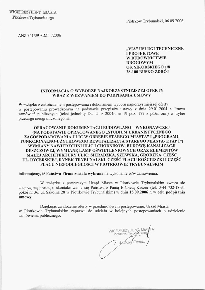 Przetarg nieograniczony na opracowanie dokumantacji bodowlano-wykonawczej wymiany nawierzchni ulic i chodników, budowę kanalizacji deszczowej, wymiane lamp oświetleniowych oraz elementów małej architektury ulic: Sieradzka, Szewska, Grodzka, cz. ul. Rycerskiej, Rynak Trybunalski, cz. Pl. Kościuszki i cz. Pl. Niepodległości w Piotrkowie Trybunalskim