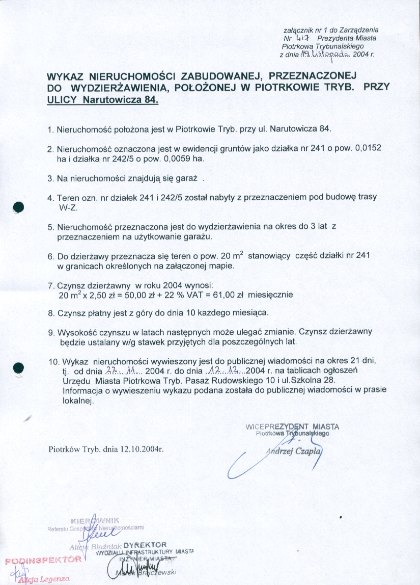 artykuł nr 1Zarządzenie Nr 417 z dn. 19 listopada 2004 r. Załączniki:Załącznik Nr 1 - wykaz nieruchomości zabudowanej, przeznaczonej do wydzierżawienia, położonej w Piotrkowie Trybunalskim714 KBOtwórz plik w Google Docs - ViewerZarządzenie Nr 417 z dn. 19.11.2004 r. ws. przeznaczenia do wydzierżawienia i ogłoszenia wykazu nieruchomości, położonej w Piotrkowie Trybunalskim przy ul. Narutowicza 84719 KBOtwórz plik w Google Docs - Viewer