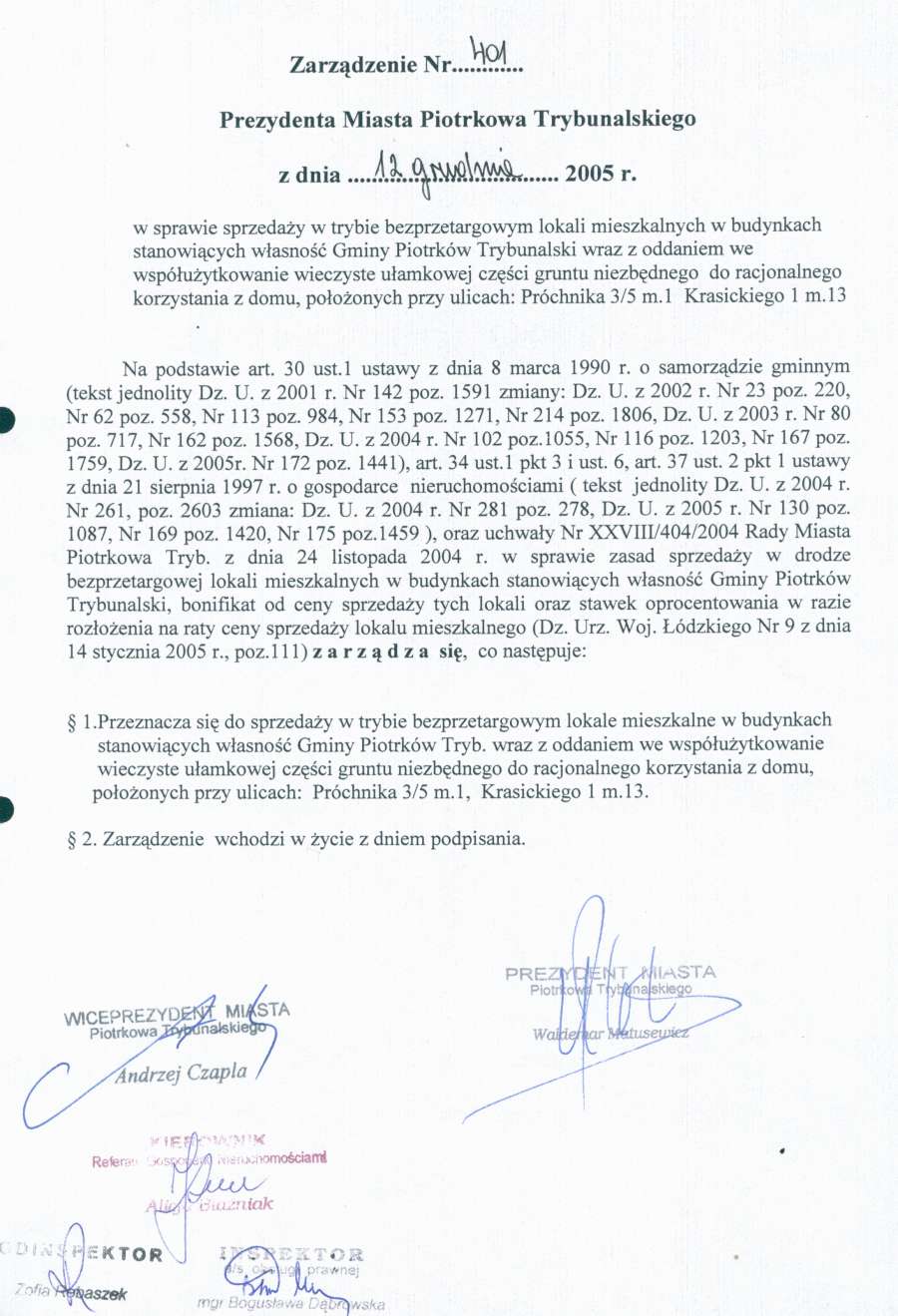 artykuł nr 1Zarządzenie Nr 401 z dn. 12 grudnia 2005 r. Załączniki:Zarządzenie Nr 401 z dn. 12.12.05 r. w/s sprzedaży w trybie bezprzetargowym lokali mieszkalnych w budynkach stanowiących własność Gminy Piotrków TRybunalski wraz z oddaniem we współuzytkowanie wieczyste ułamkowej części gruntu niezbędnego do racjonalnego korzystania z domu, położonych przy ul. Próchnika 3/5 m. 1, Krasickiego 1 m. 13113 KBOtwórz plik w Google Docs - Viewer